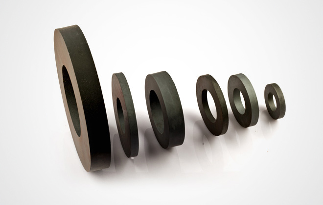 鐵氧體磁鐵主要是以SrO以及Fe2O3為主要原料,通過陶瓷燒結工藝制作而成。該種磁鐵防腐性能很好,不必進行表面電鍍處理。產品形狀可以制作成圓環形、圓柱形、方塊形和瓦片形。